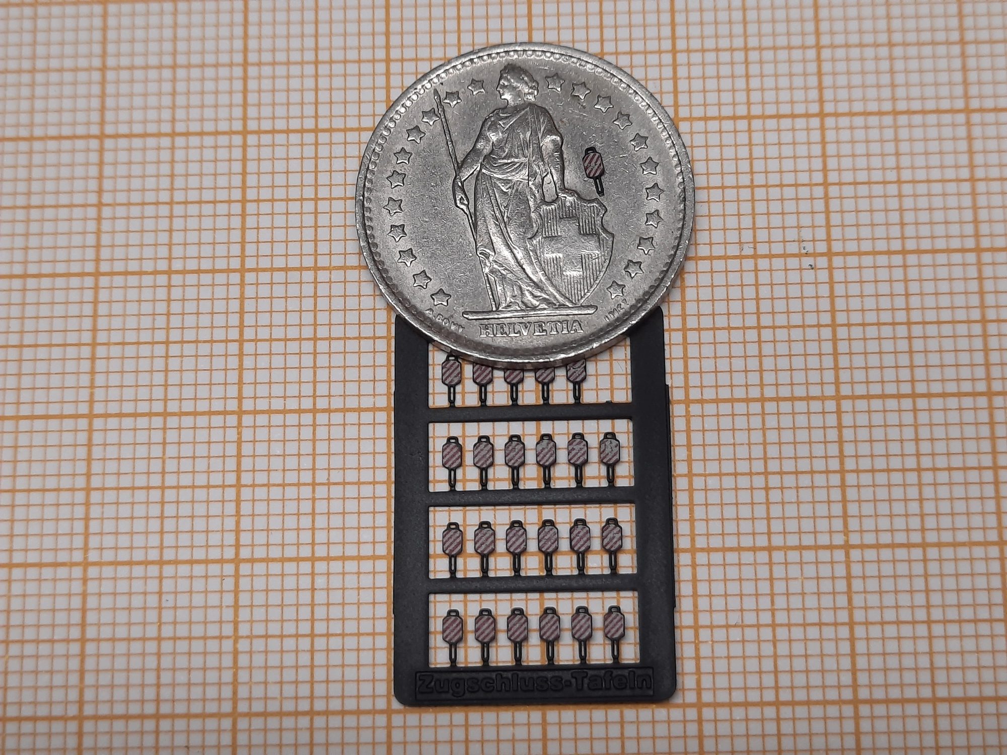 24 Zugschlusstafeln im Ätzrähmchen, lackiert und bedruckt.